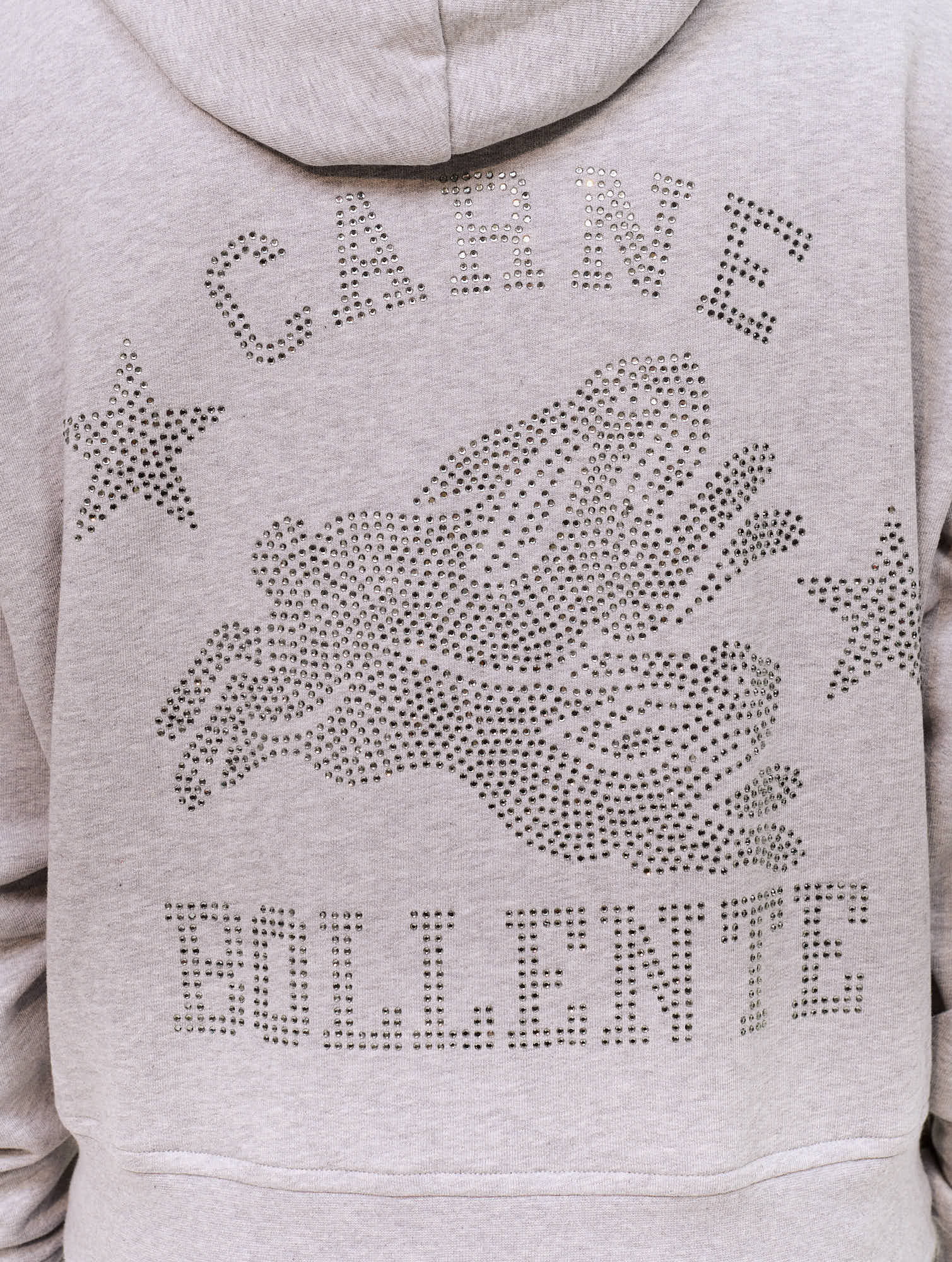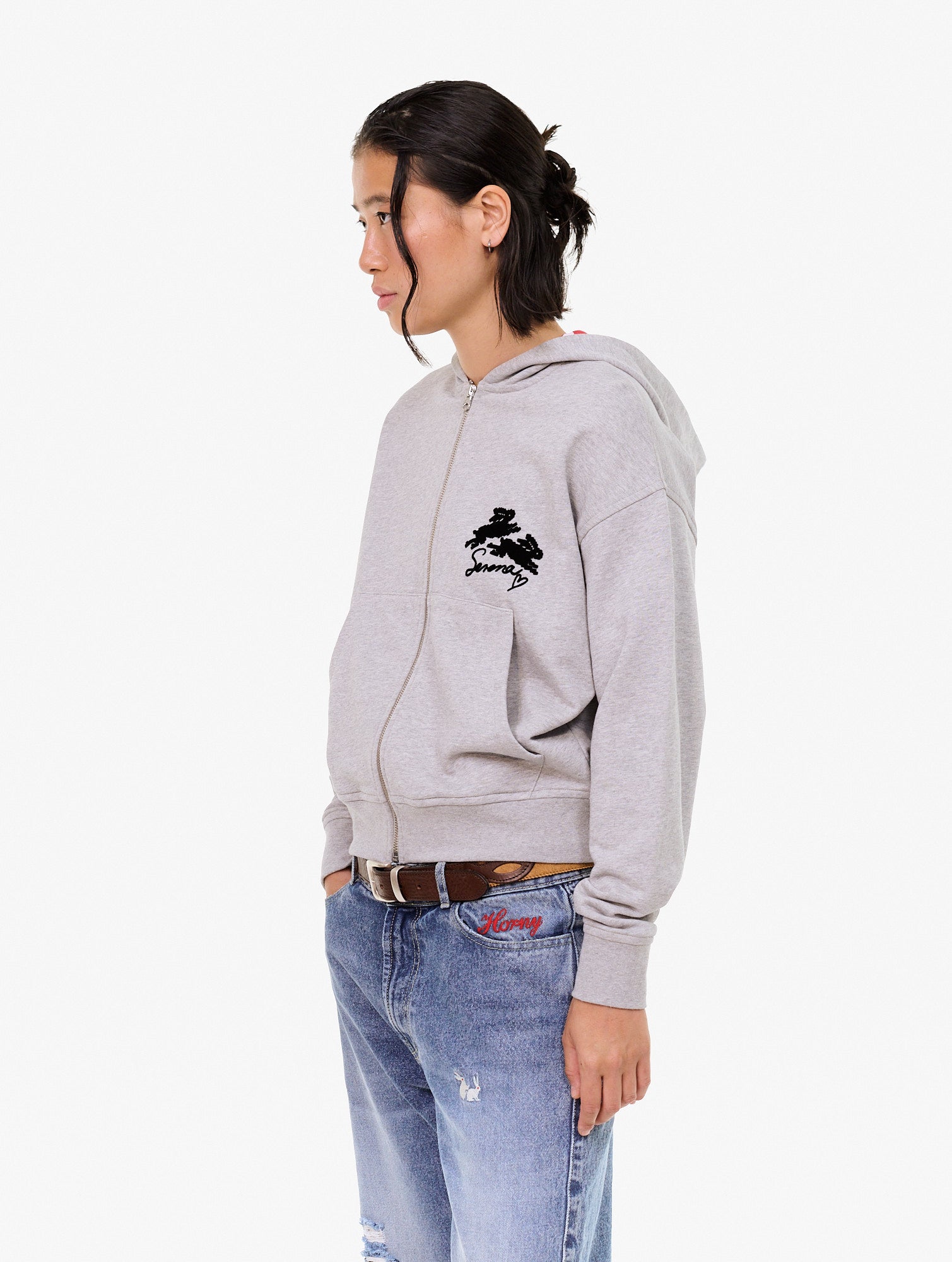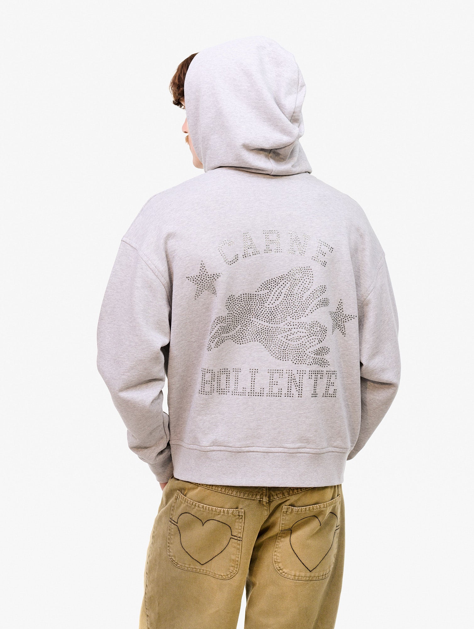 Zipup hoodie. with a front graphic print and rhinestone details, and a graphic print on the back. 100% Organic Combed Cotton.