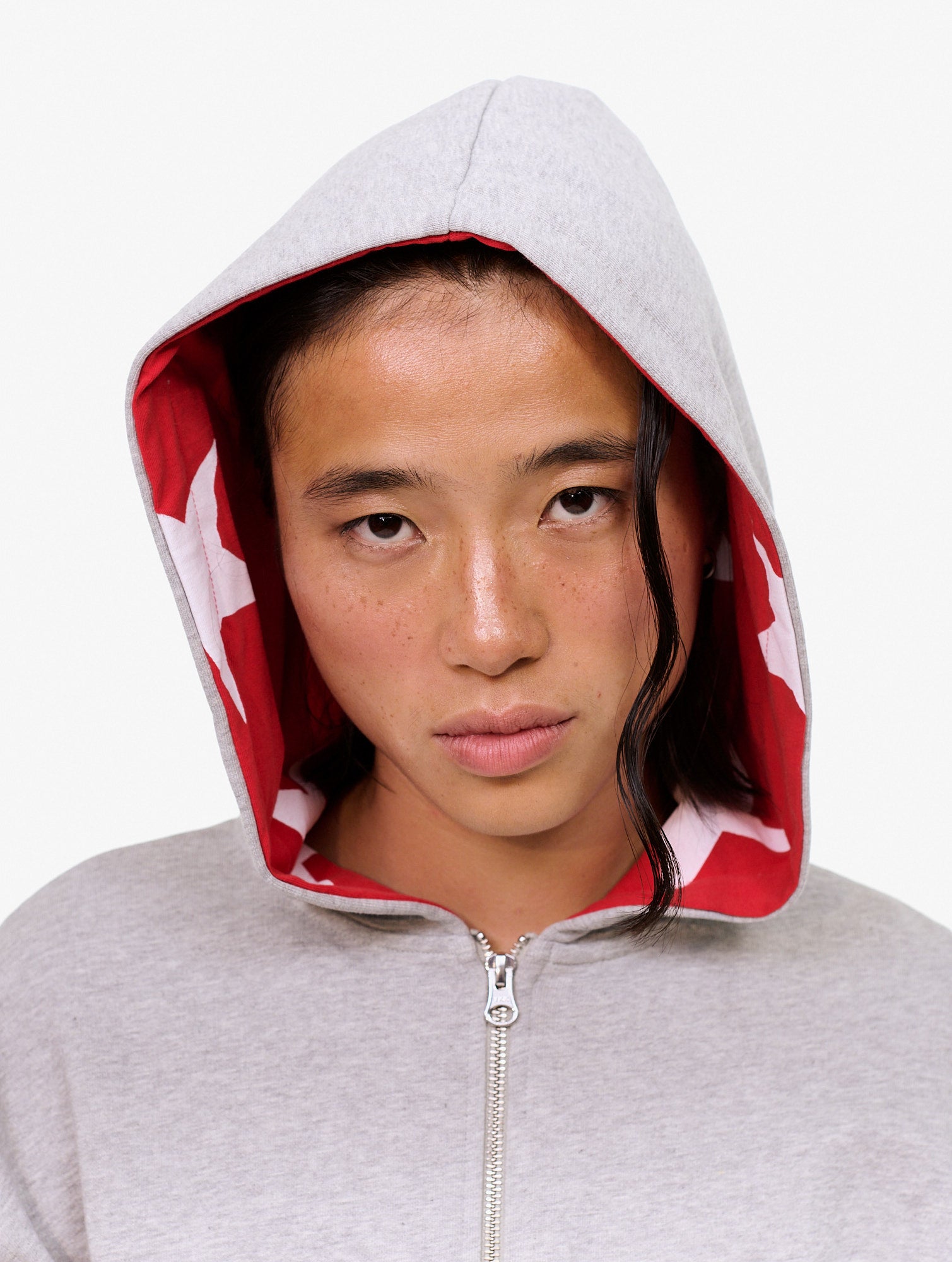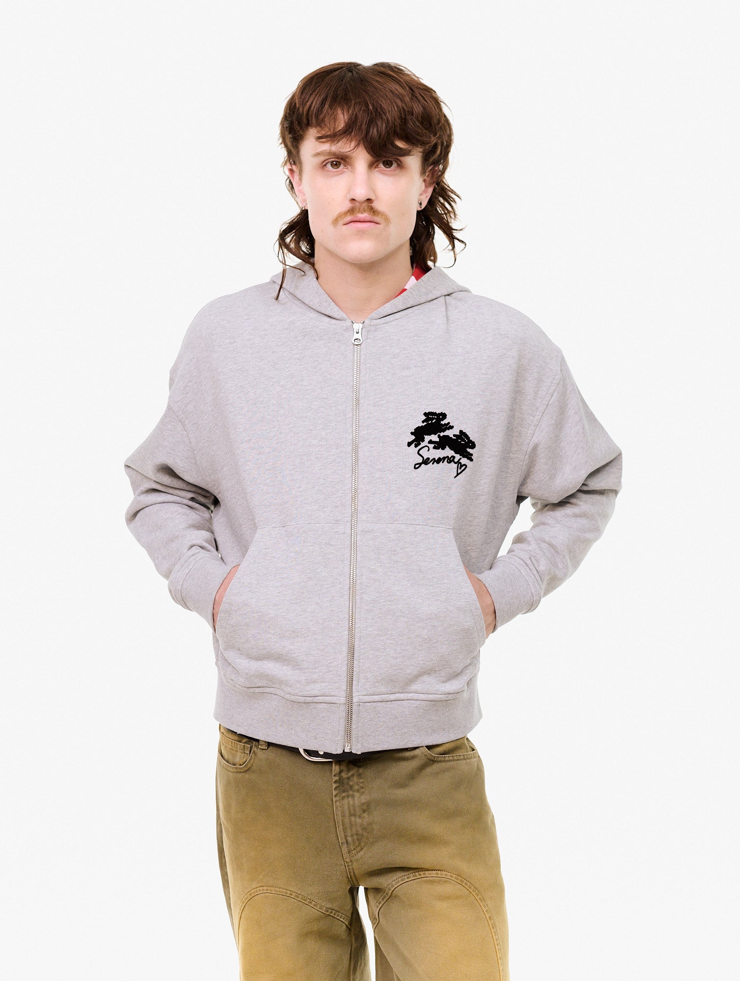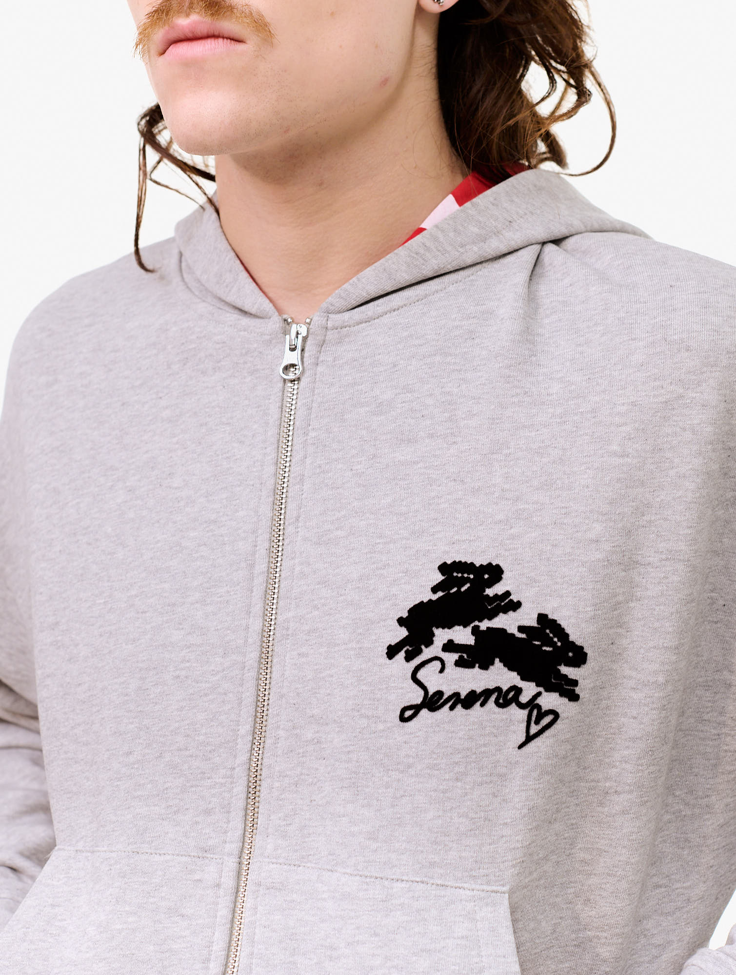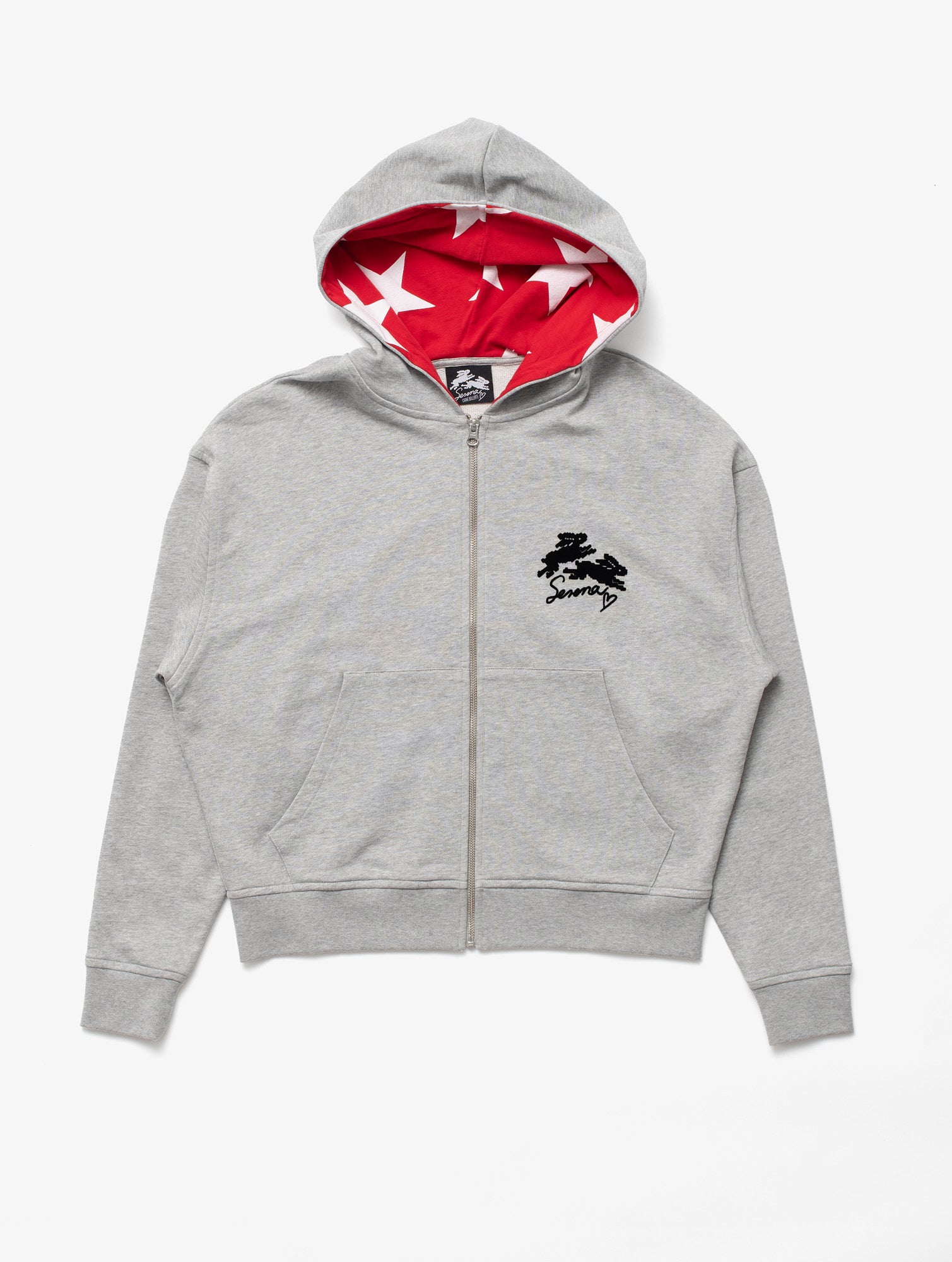 Zipup hoodie. with a front graphic print and rhinestone details, and a graphic print on the back. 100% Organic Combed Cotton.
