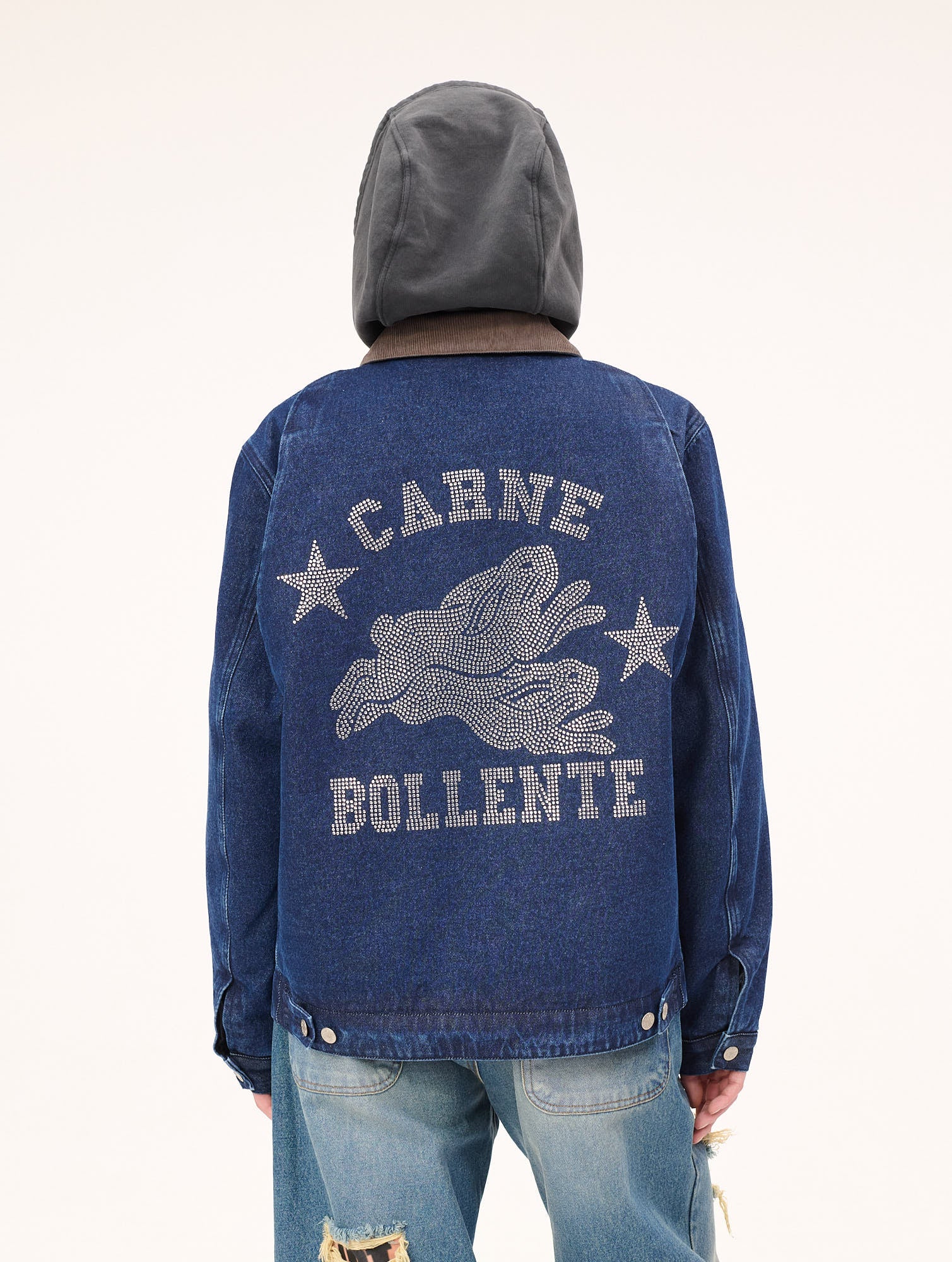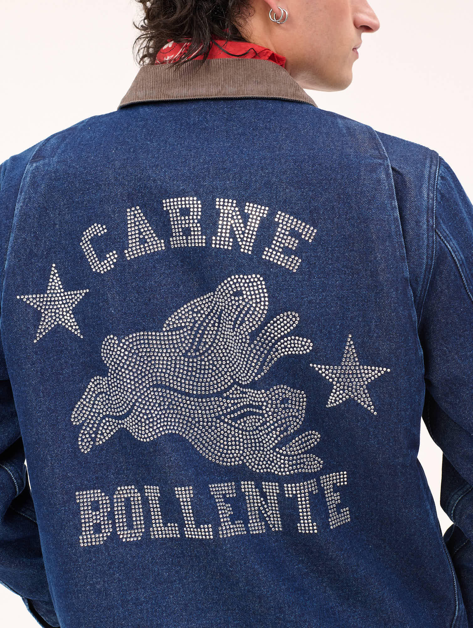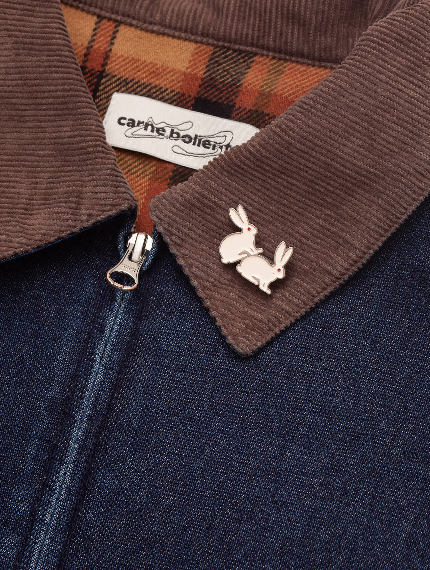 - 100%コットンのデニム ジップアップ ジャケット。襟にウサギのピンが付いており、背面にグラフィック プリントが施されています。