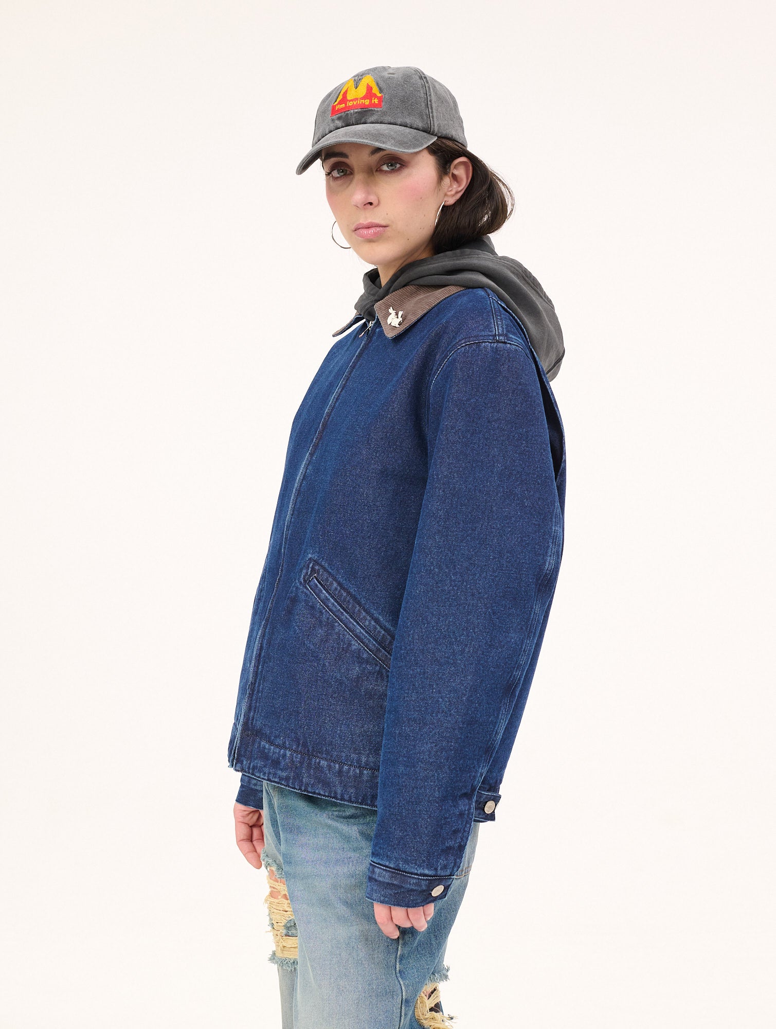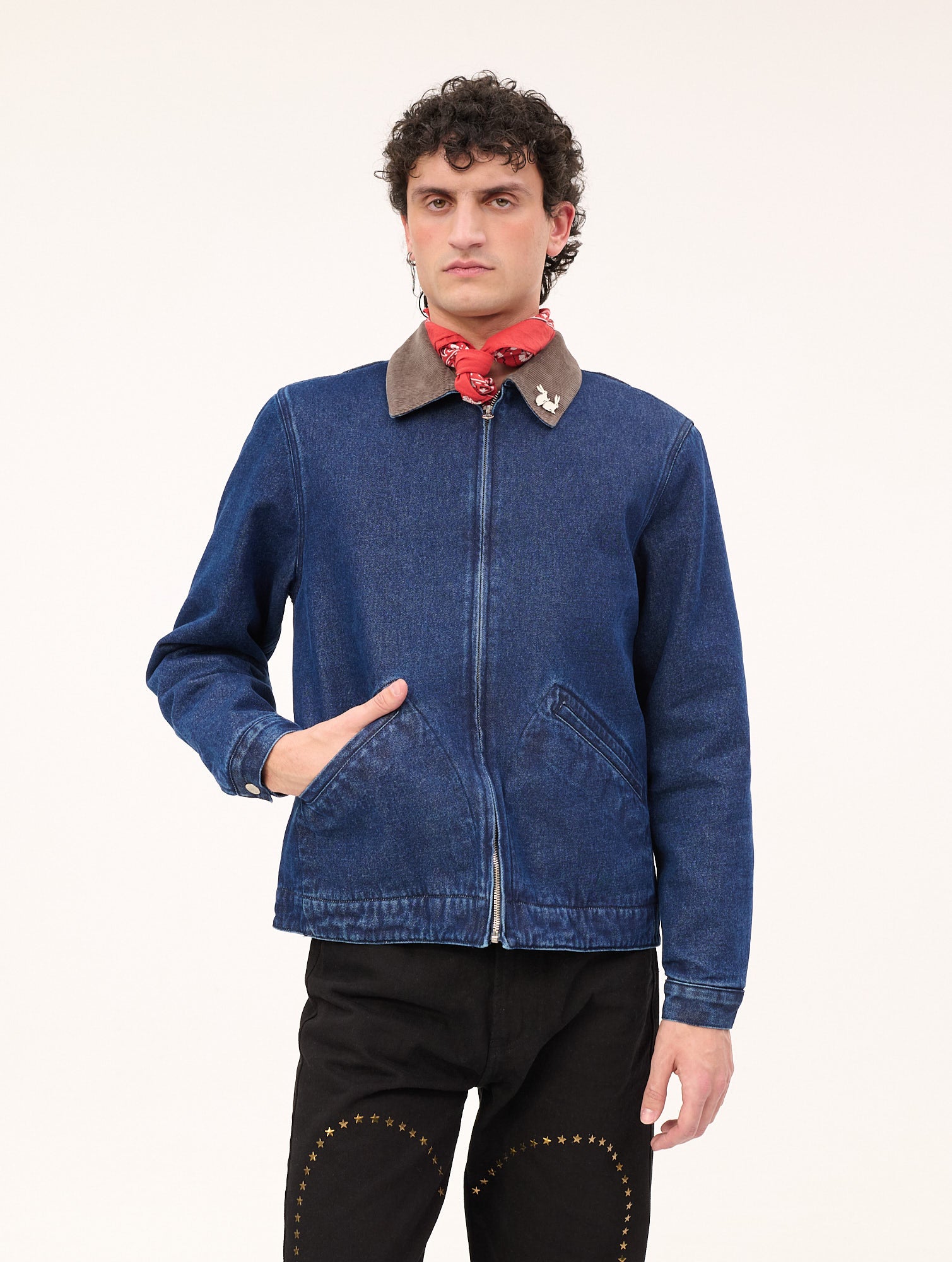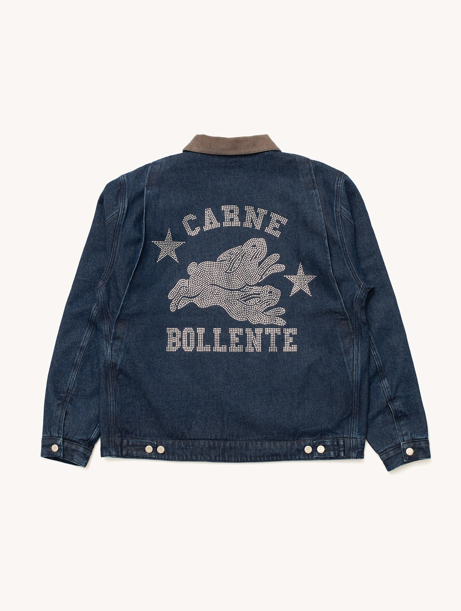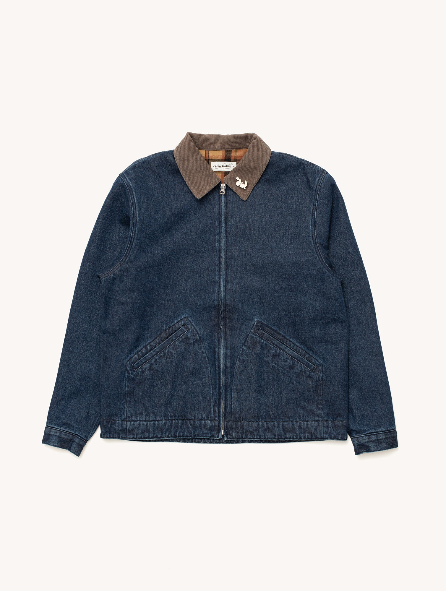 - 100%コットンのデニム ジップアップ ジャケット。襟にウサギのピンが付いており、背面にグラフィック プリントが施されています。