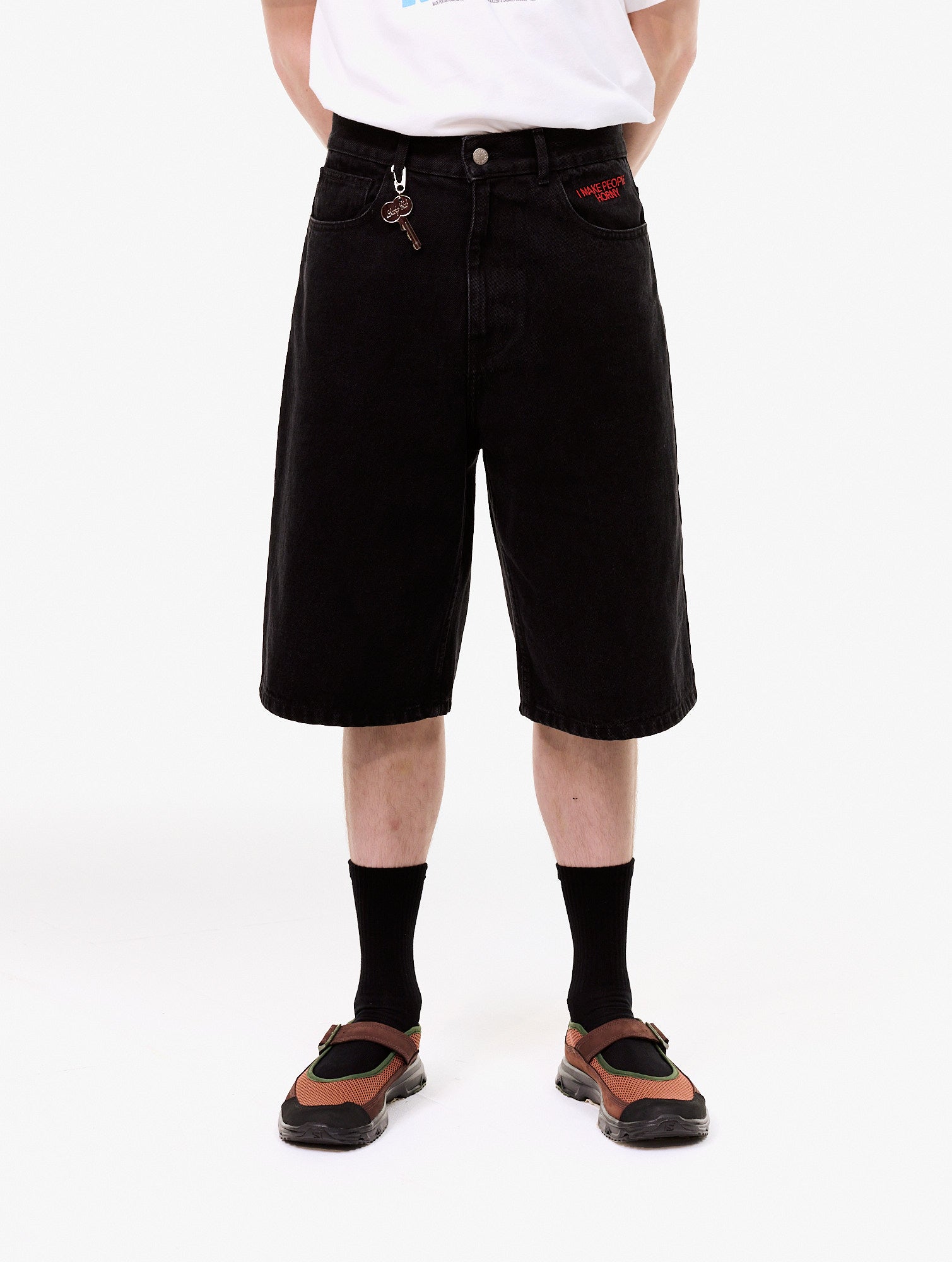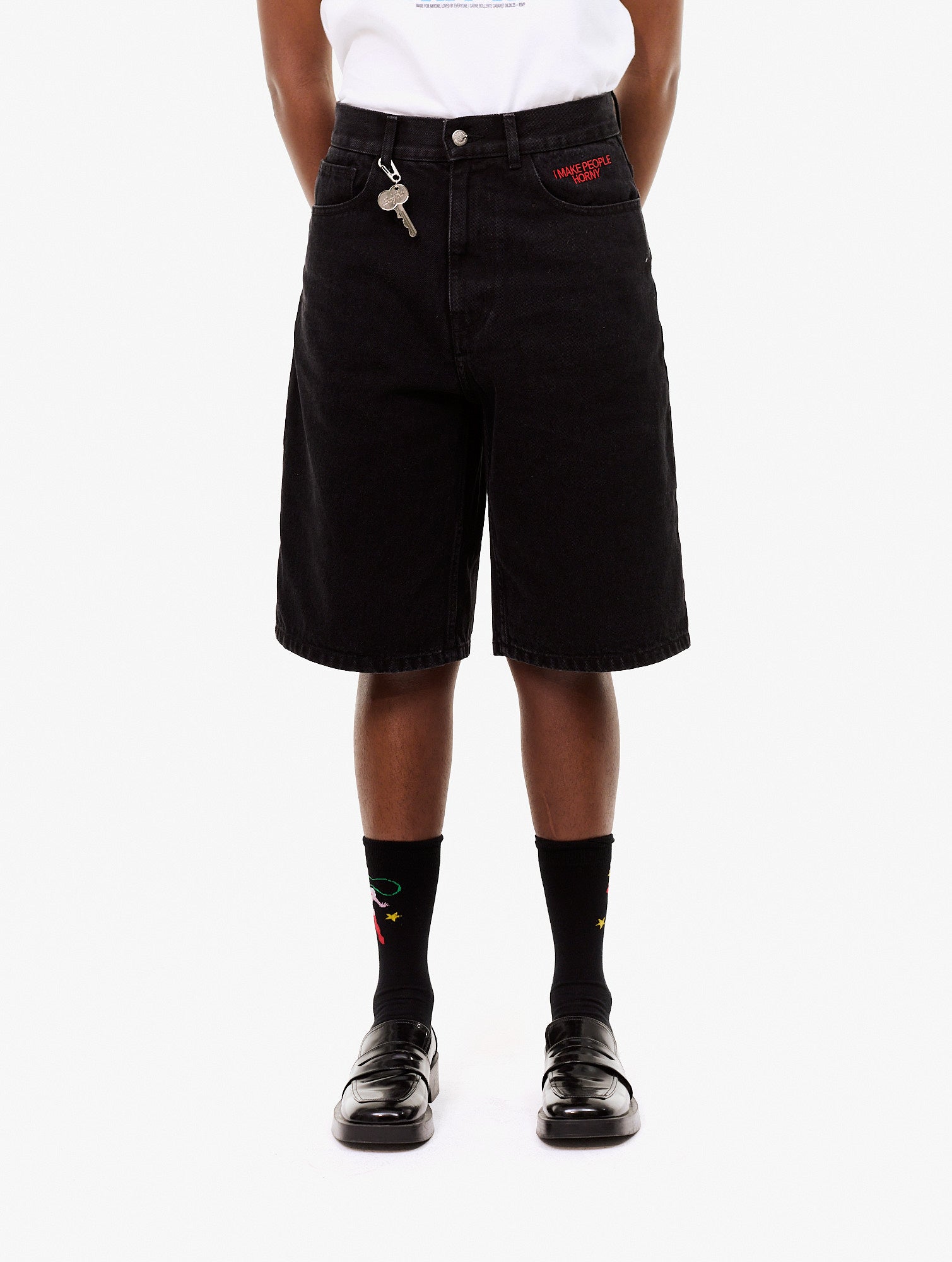 Straight denim shorts. with an embroidered graphic on the left front pocket, heartshaped embroidered stitches on the back pockets, and a keychain attached to the front belt loop. 100% Organic Cotton. Key: Zinc Alloy.