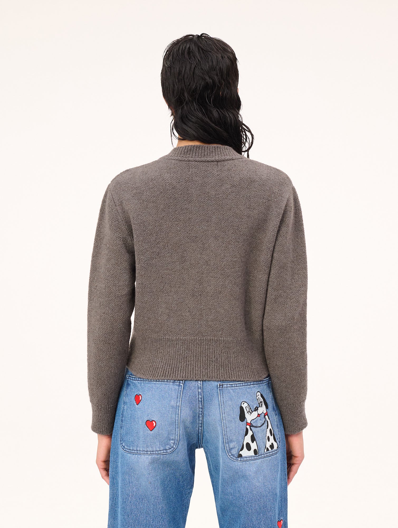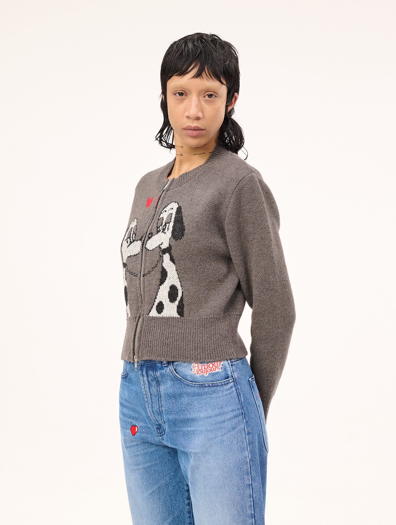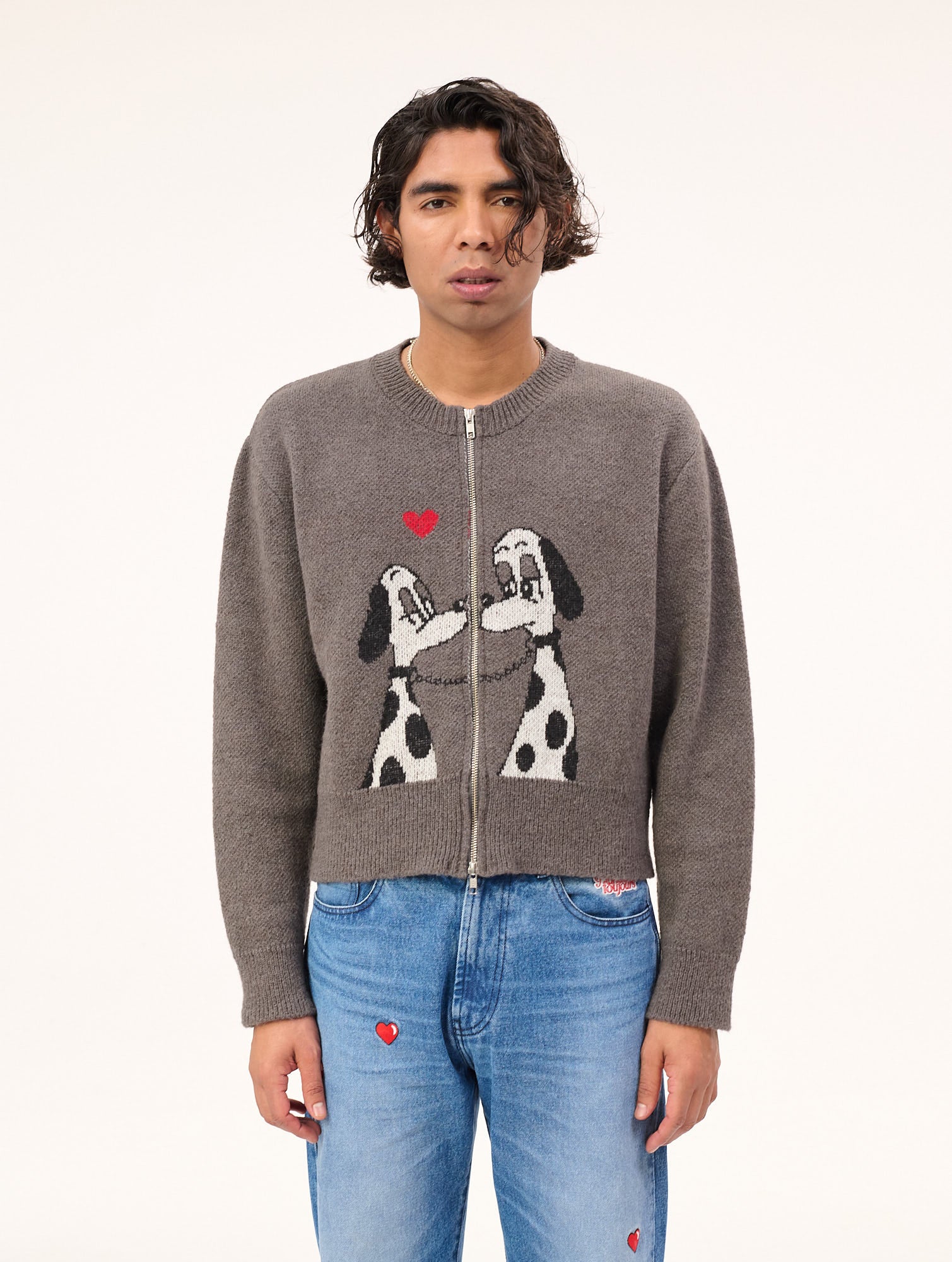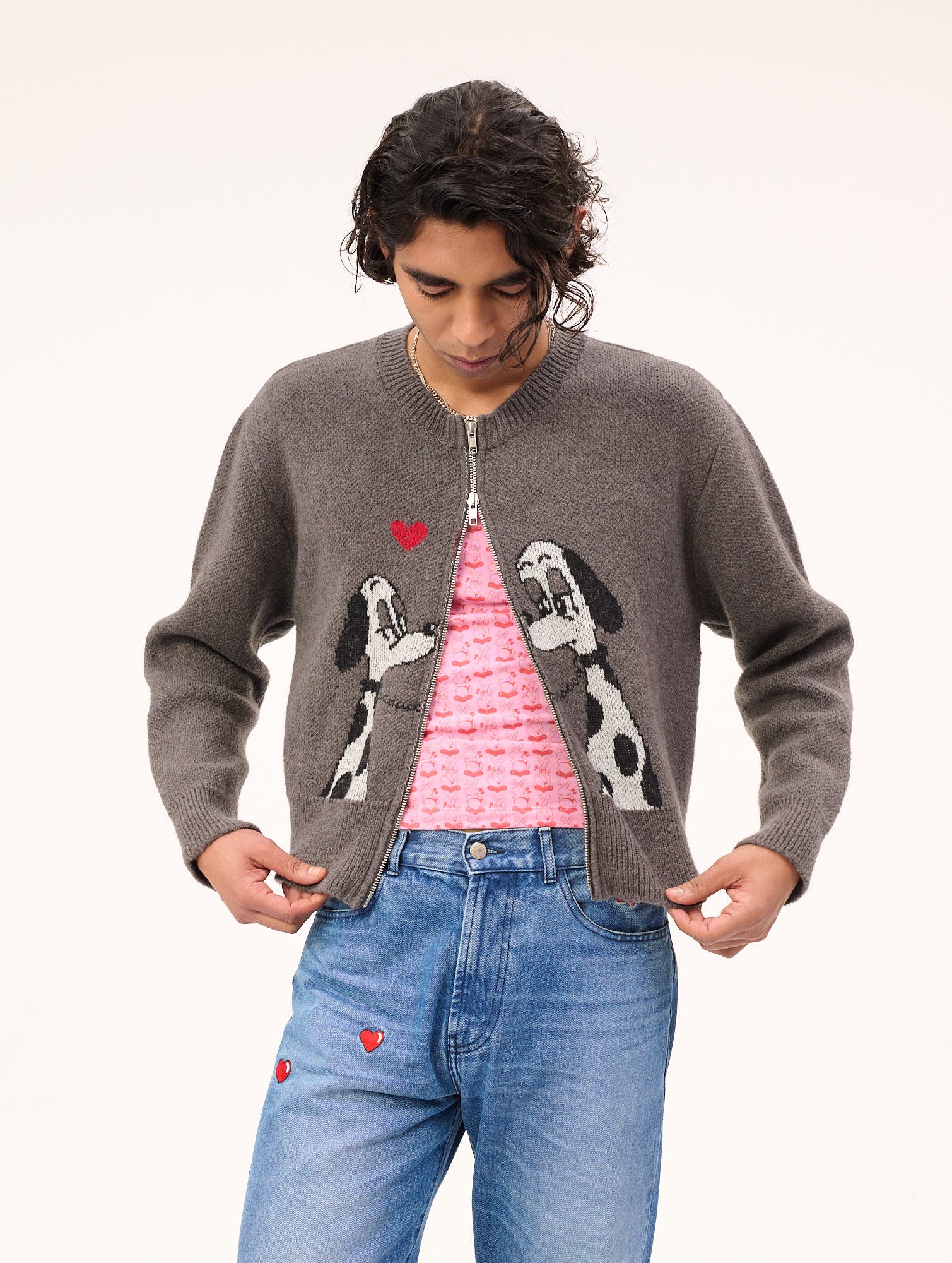 - Double Zipper Knitted Sweater with a jacquard front graphic.