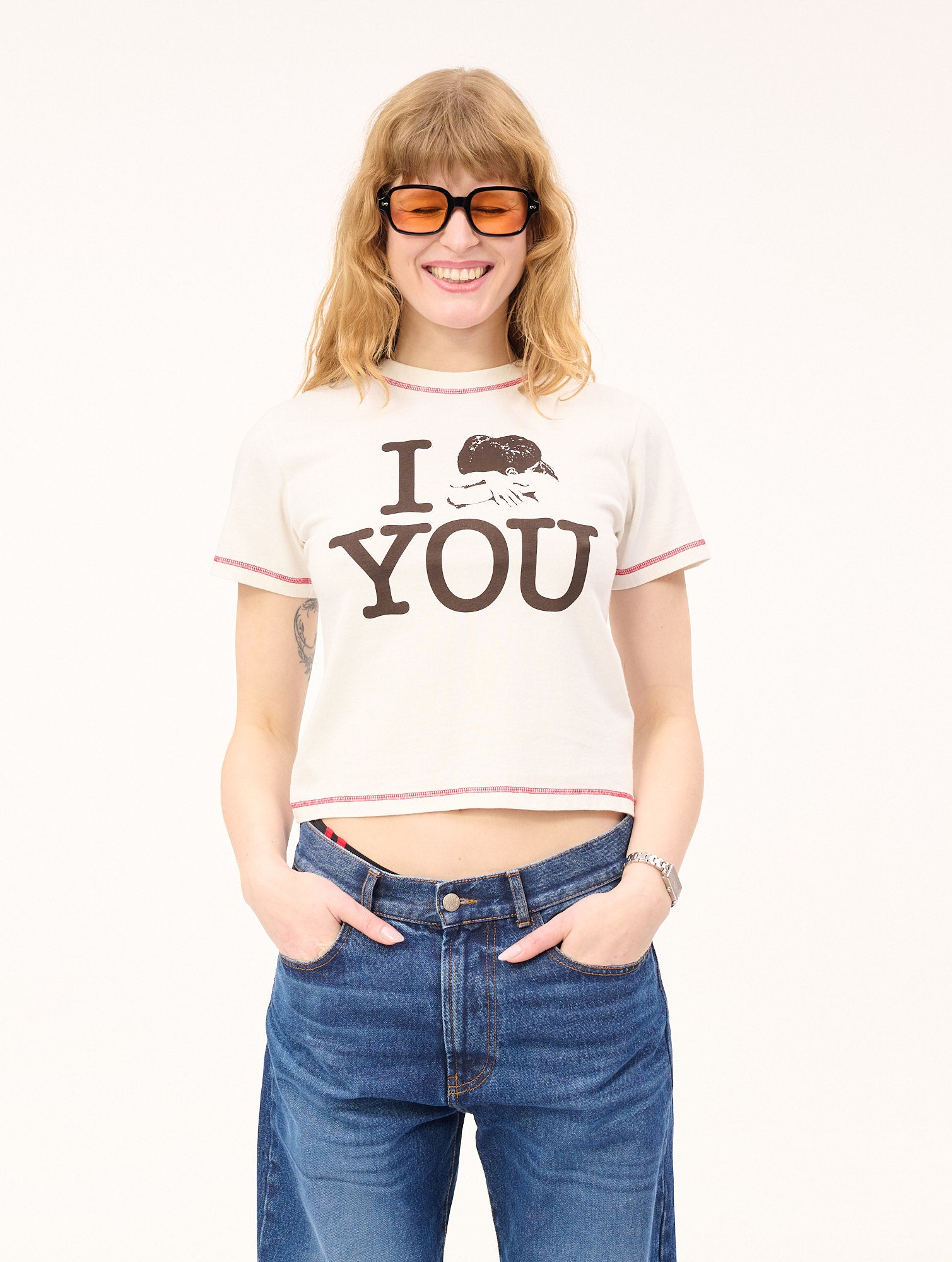 - Short sleeve Baby T-shirt in 100% organic cotton with a matte front graphic print and red stitched details on the collar, sleeves, and hem.