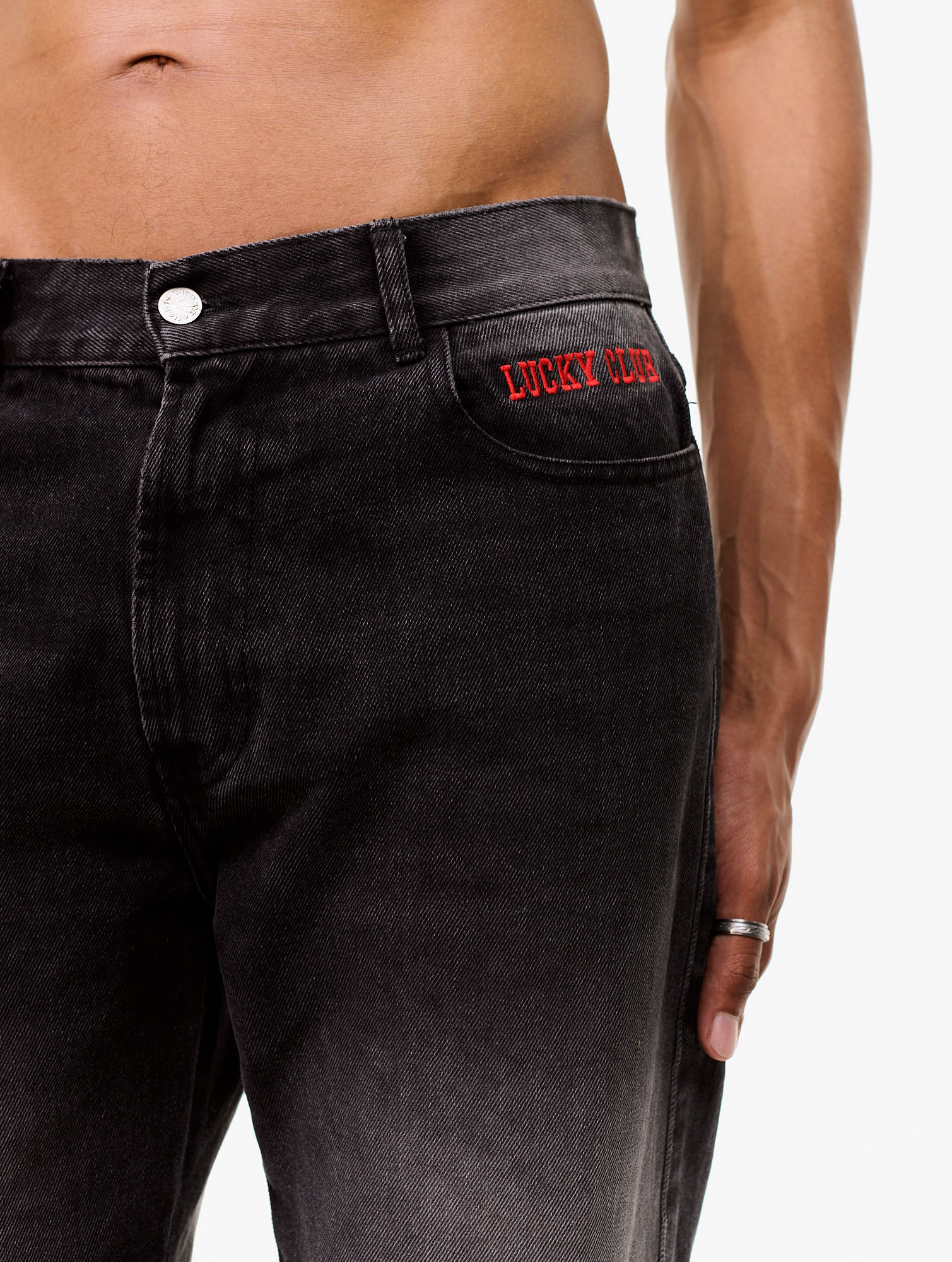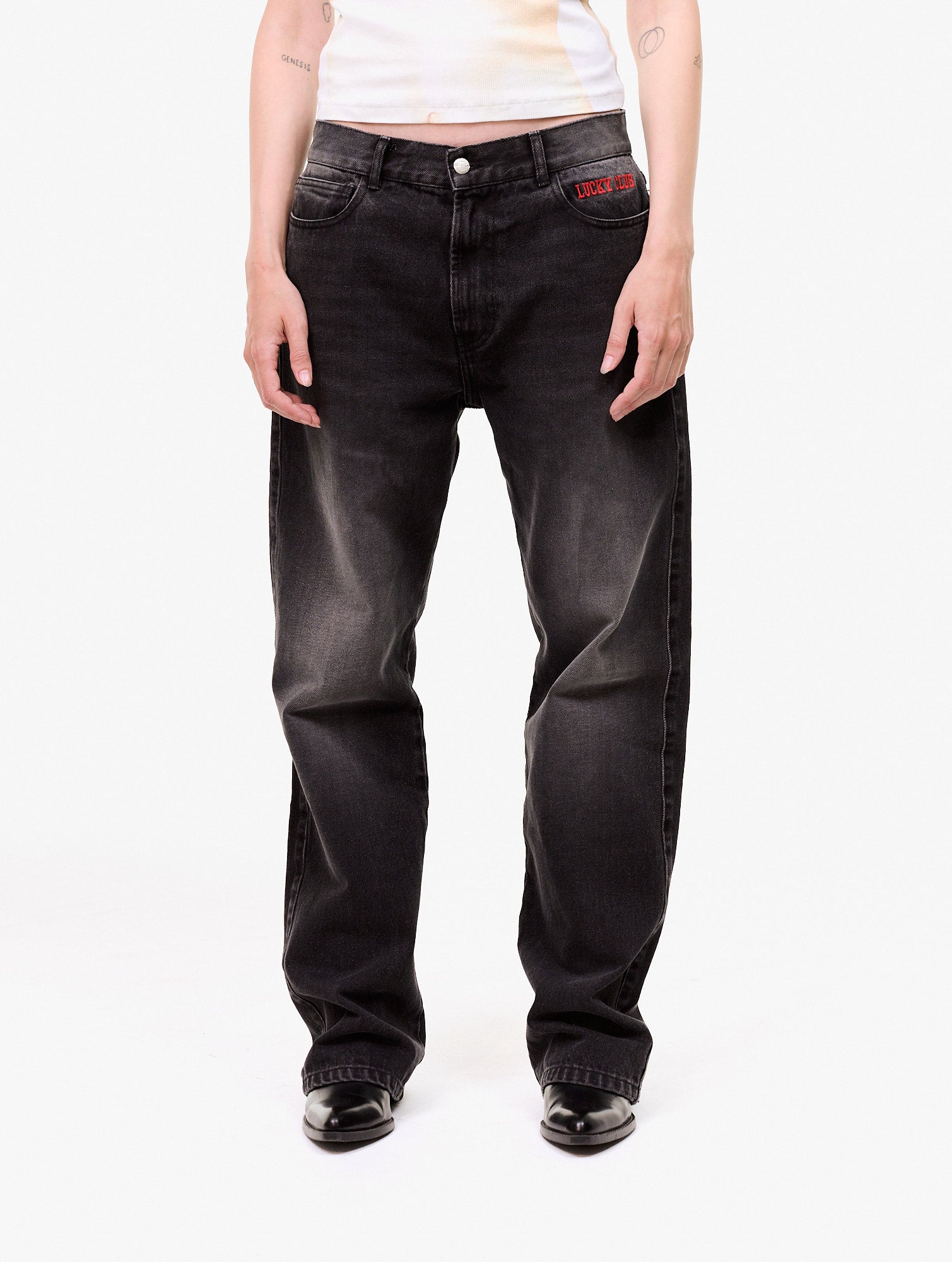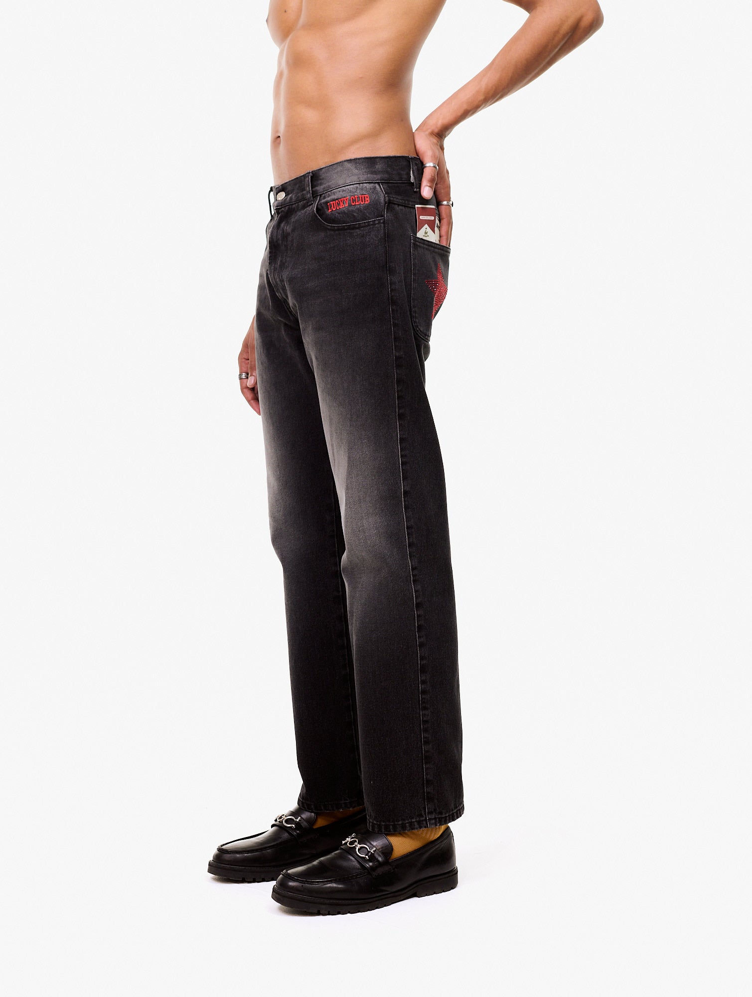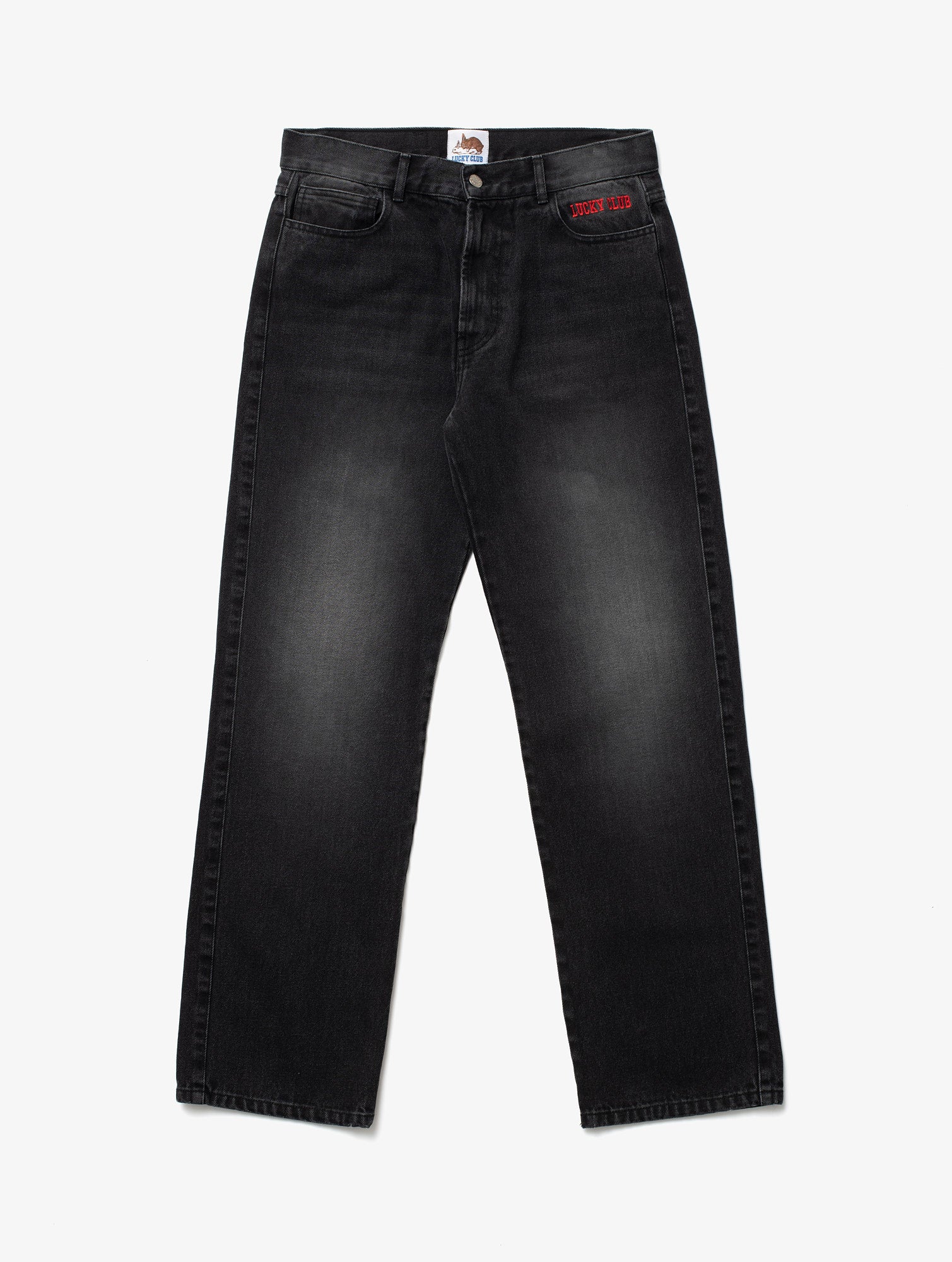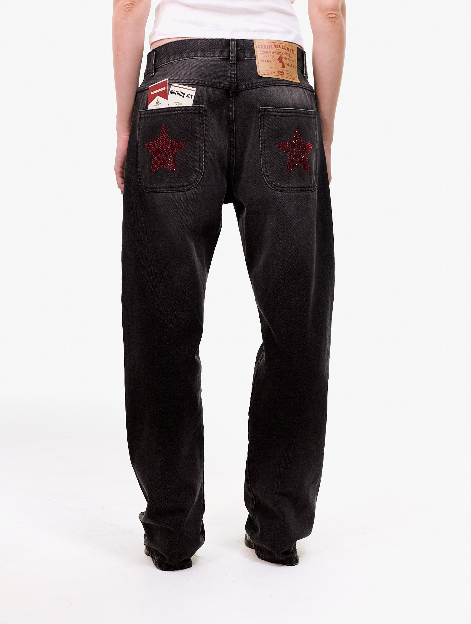 Straight denim trousers with an embroidered graphic on the left front pocket, rhinestone prints on the back pockets, and a graphic print on the left back pocket. 100% Organic Cotton.
