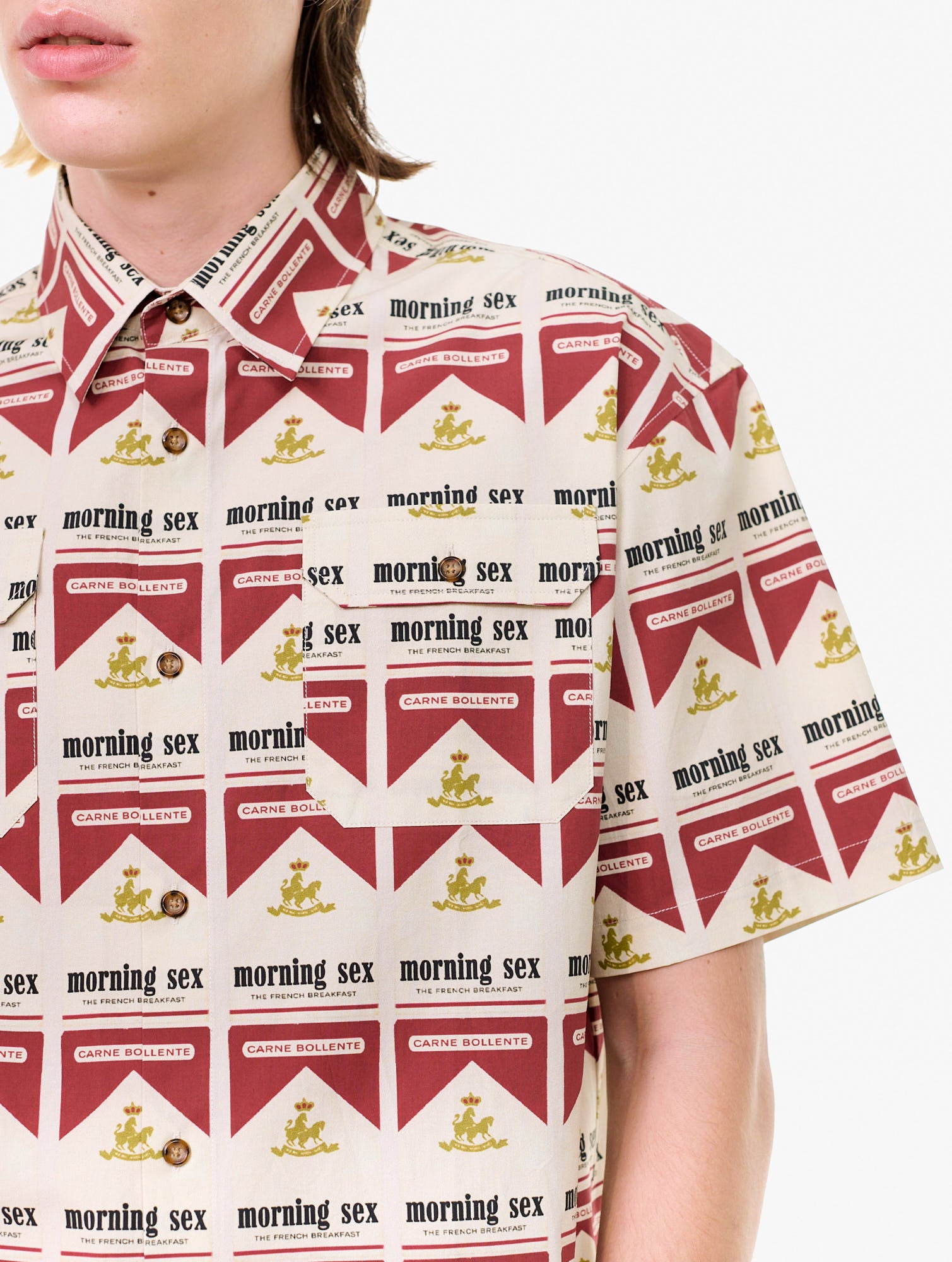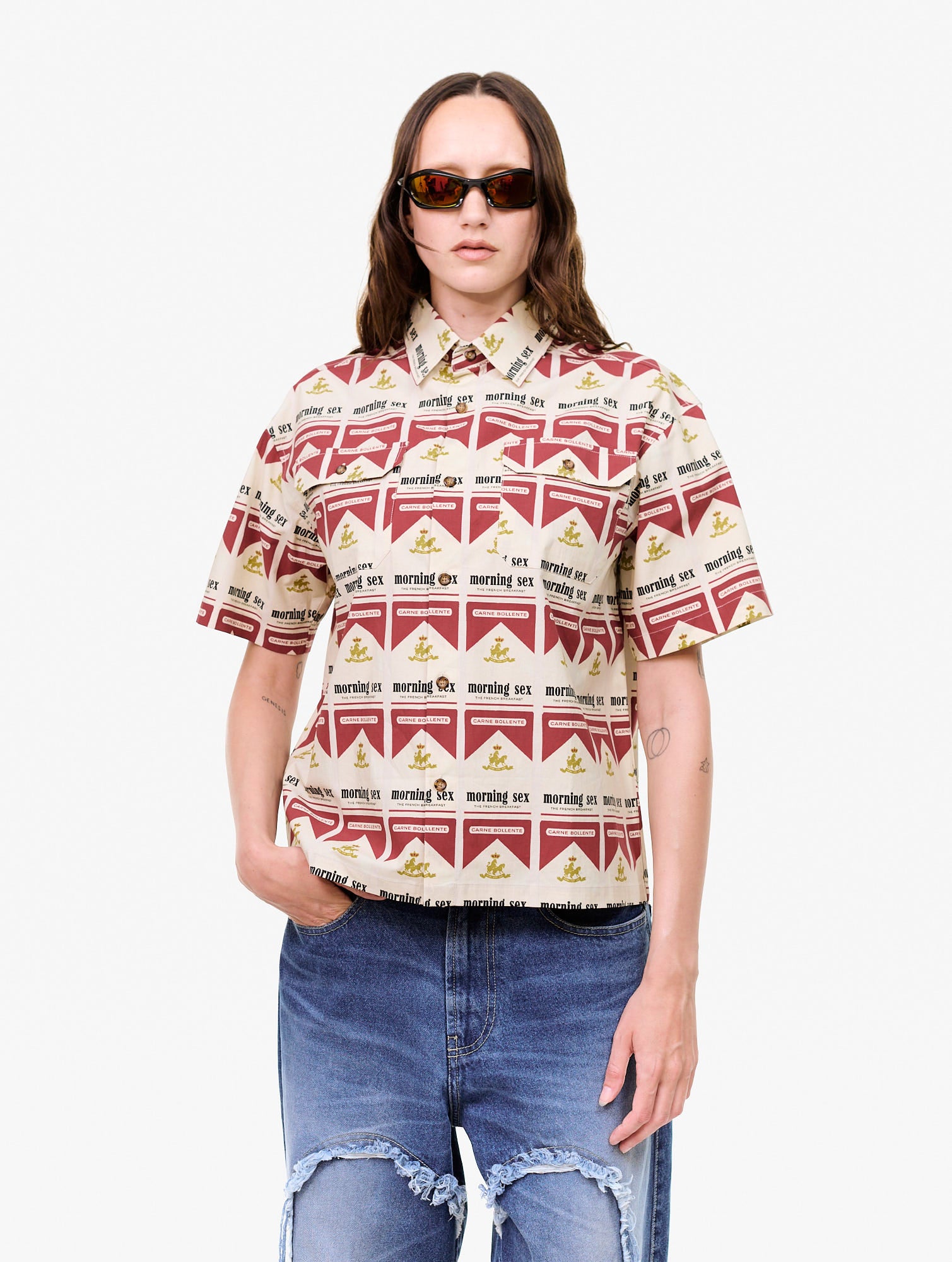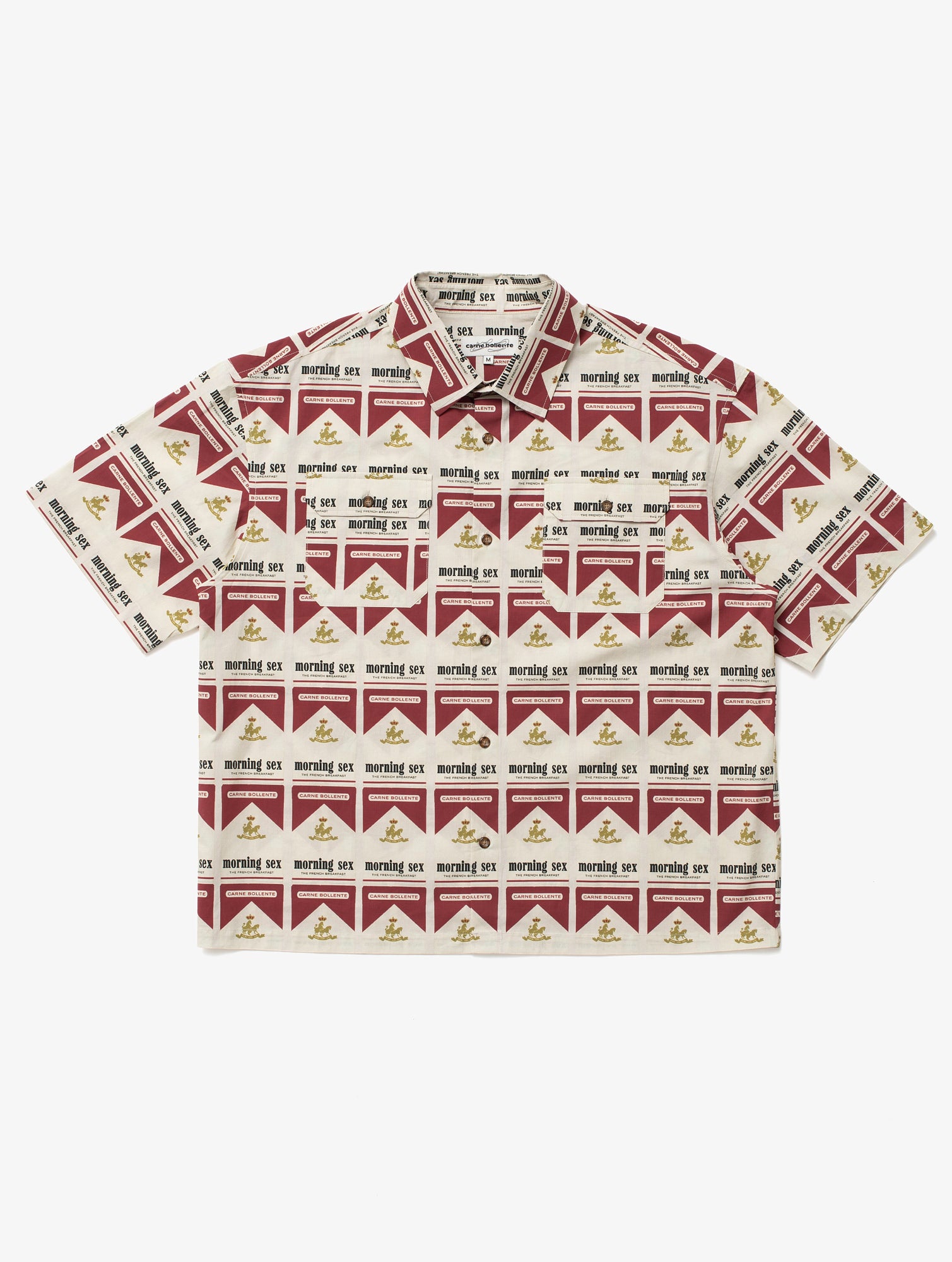 Buttonup shortsleeve shirt with an allover graphic print and two chest pockets. 97% Cotton, 3% Spandex.